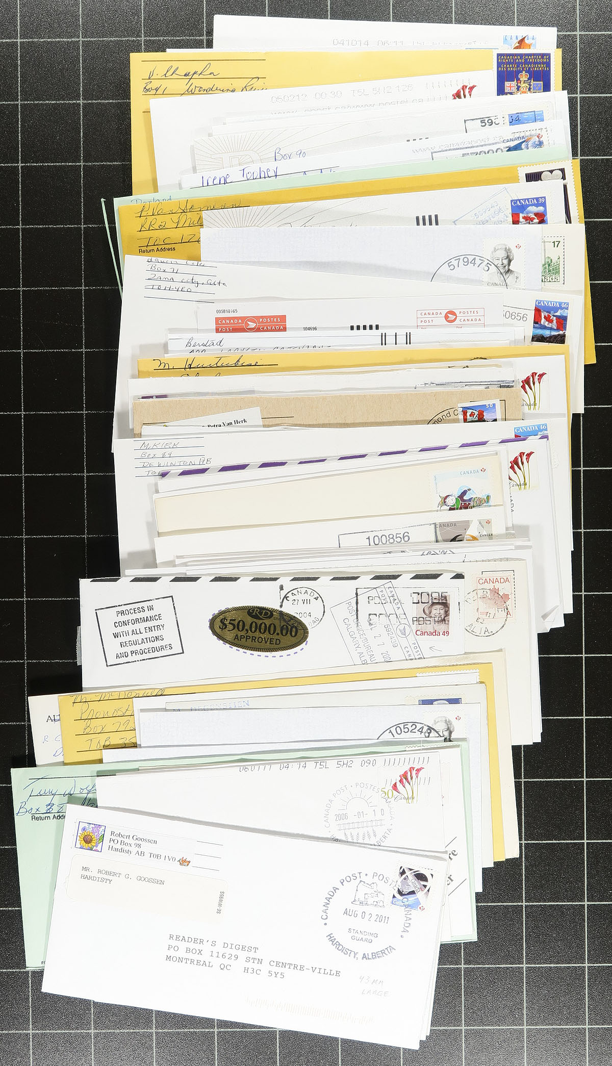 Alberta Postal History. Group of roughly 250 covers collected for Alberta town postmarks, 1960's-2000's, generally from town A to Z, with roughly over 100 different town represented, including various postal outlets including Dixonville, Grassy Lake, Fox Lake, Frog Lake, Falun, Sedalia, Peers, Patricia, Paradise Valley, and much more. Postmark interest includes various POCON types, cds, duplex, Pictorials, and more, with some towns having various postmark types. A nice lot for the Alberta or Canada postmark collector. Estimate =