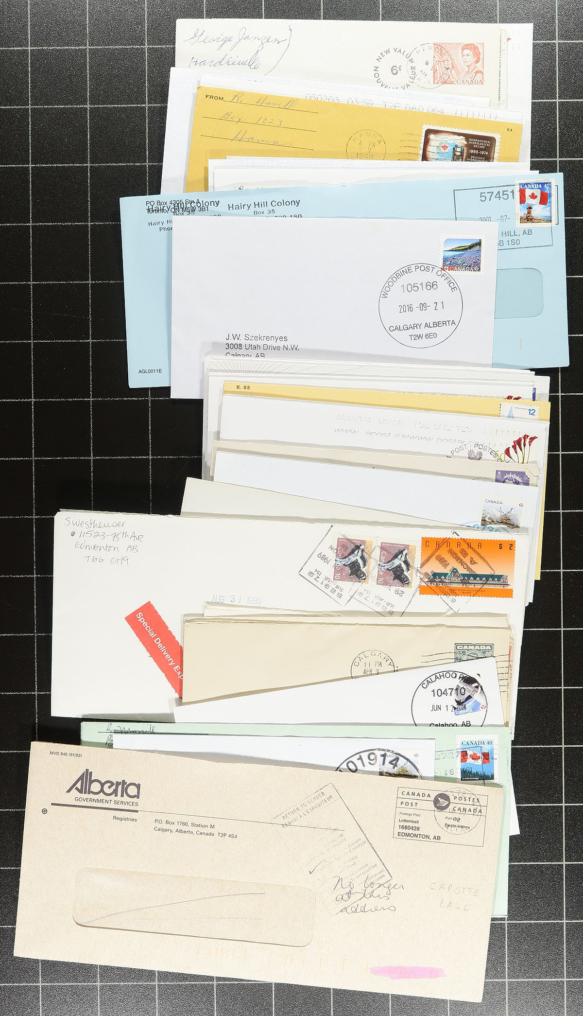 Alberta Postal History. Group of roughly 250 covers collected for Alberta town postmarks, 1960's-2000's, generally from town A to Z, with roughly over 100 different town represented, including various postal outlets including Dixonville, Grassy Lake, Fox Lake, Frog Lake, Falun, Sedalia, Peers, Patricia, Paradise Valley, and much more. Postmark interest includes various POCON types, cds, duplex, Pictorials, and more, with some towns having various postmark types. A nice lot for the Alberta or Canada postmark collector. Estimate =