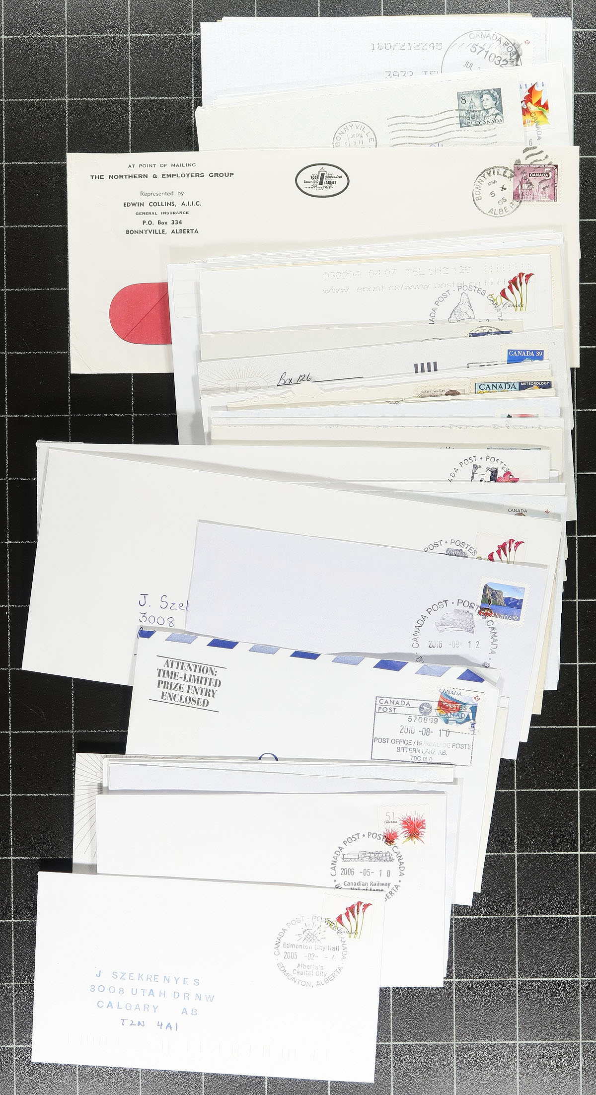 Alberta Postal History. Group of roughly 250 covers collected for Alberta town postmarks, 1960's-2000's, generally from town A to Z, with roughly over 100 different town represented, including various postal outlets including Dixonville, Grassy Lake, Fox Lake, Frog Lake, Falun, Sedalia, Peers, Patricia, Paradise Valley, and much more. Postmark interest includes various POCON types, cds, duplex, Pictorials, and more, with some towns having various postmark types. A nice lot for the Alberta or Canada postmark collector. Estimate =
