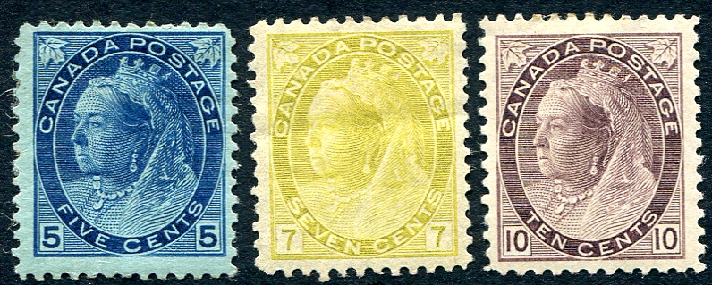 F/VF mint Hinged / Hinge Remnant trio of 1898-1902 issued QV Numeral issues mid/high-values including the 5c blue, 7c yellow ochre and 10c brown violet. A high-powered trio. 2025 Scott US$840.00 =