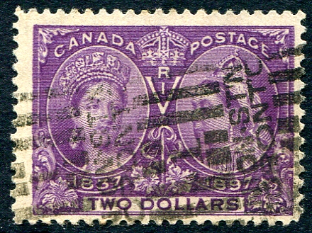 F/VF centered used example of the $2.00 dark purple 1897 Queen Victoria Jubilee issue. Tidy "UNION ST’N TORONTO" roller cancel. Vibrant colour on this often faded stamp! 2025 Scott US$550.00 =