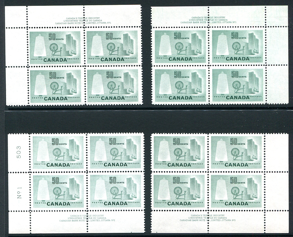 VF mint Never Hinged matched sets of Plate Blocks (plate #1) of the 1953 issued 50c Textile in both regular issue, and then "G" official "Flying G" overprint. A pristine group. 2024 Unitrade =