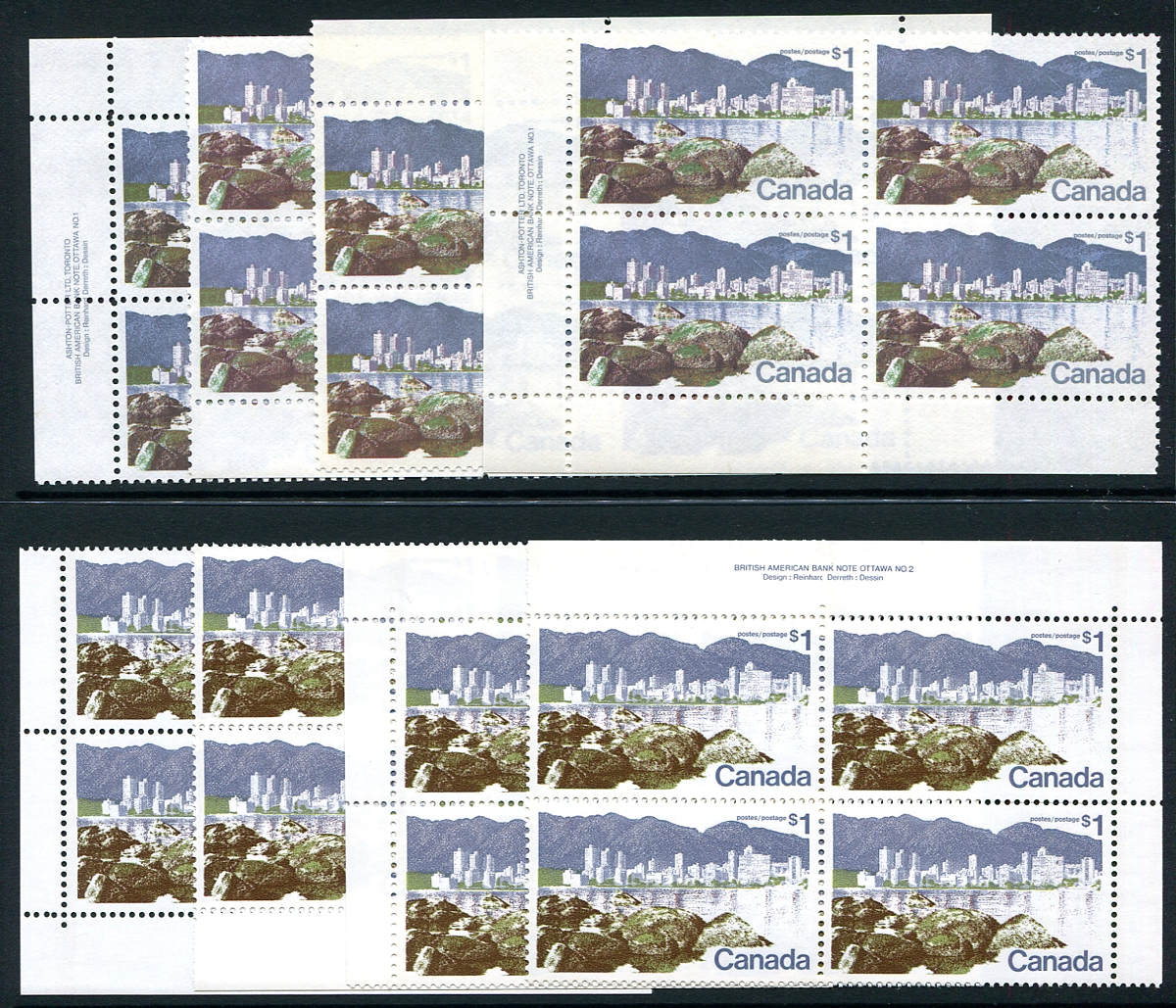 VF mint Never Hinged matched sets of Plate Blocks for Plate #1 and Plate #2 of the 1973 Vancouver Harbour $1.00 high-value definitive. Nice to get these both at the same time. 2024 Unitrade =