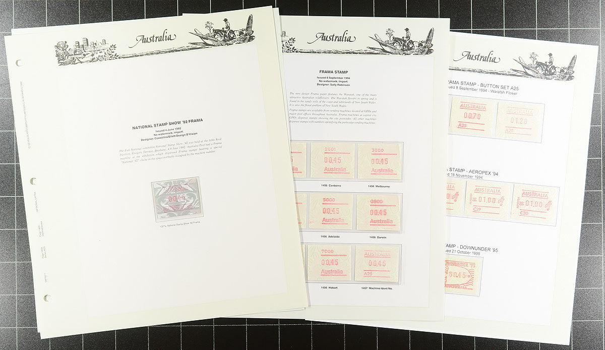 Comprehensive collection of 1984-1999 issue FRAMA labels, all neatly mounted on Seven Seas album pages within a deluxe Seven Seas padded album with slipcase (cost of the album alone well over $100.00). Consists of 212 mint and used labels and 40 covers, all between Seven Seas catalogue #912b // 1736bs. The odd missing stamp noted, but largely complete for the period These are an often overlooked yet still essential part of any Australian collection. Older 2002 Seven Seas catalogue over AUD$590.50 ($536.50 CDN), plus the high-quality album. Estimate =