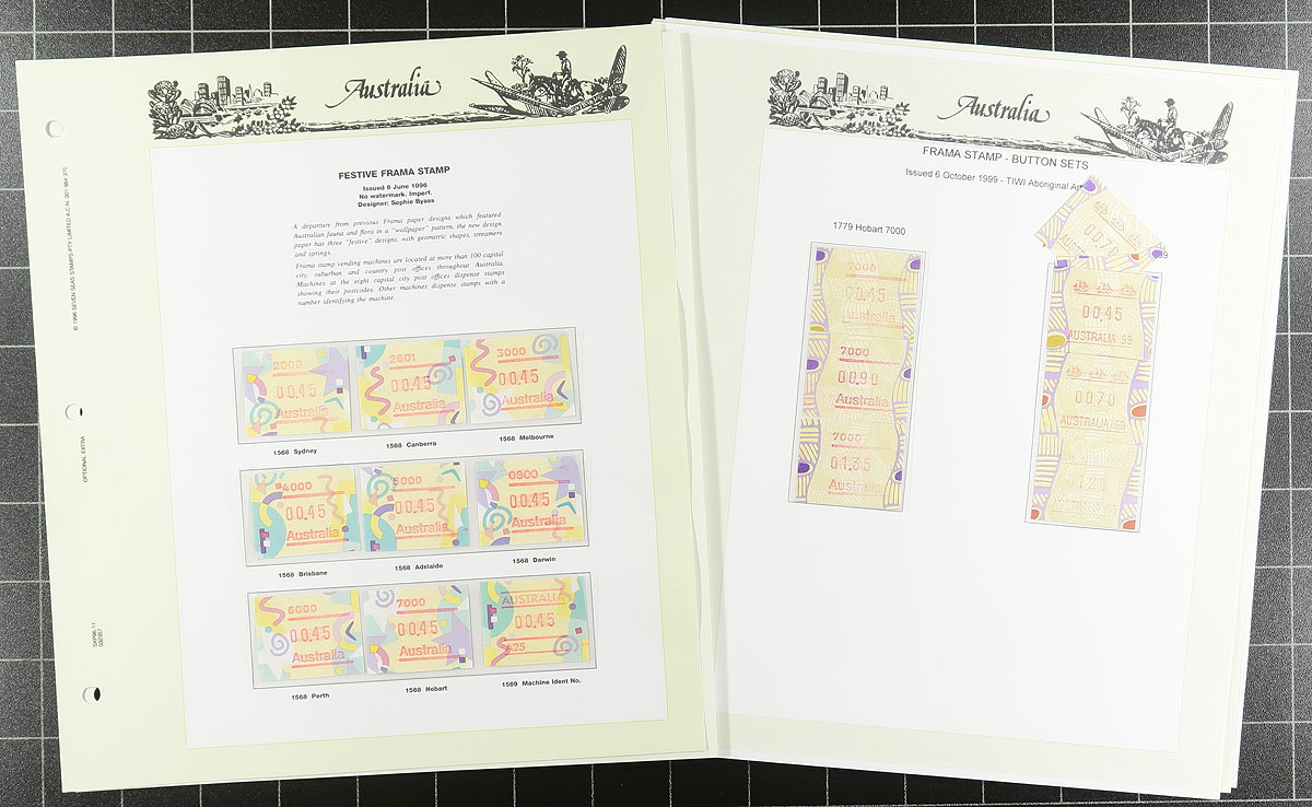 Comprehensive collection of 1984-1999 issue FRAMA labels, all neatly mounted on Seven Seas album pages within a deluxe Seven Seas padded album with slipcase (cost of the album alone well over $100.00). Consists of 212 mint and used labels and 40 covers, all between Seven Seas catalogue #912b // 1736bs. The odd missing stamp noted, but largely complete for the period These are an often overlooked yet still essential part of any Australian collection. Older 2002 Seven Seas catalogue over AUD$590.50 ($536.50 CDN), plus the high-quality album. Estimate =