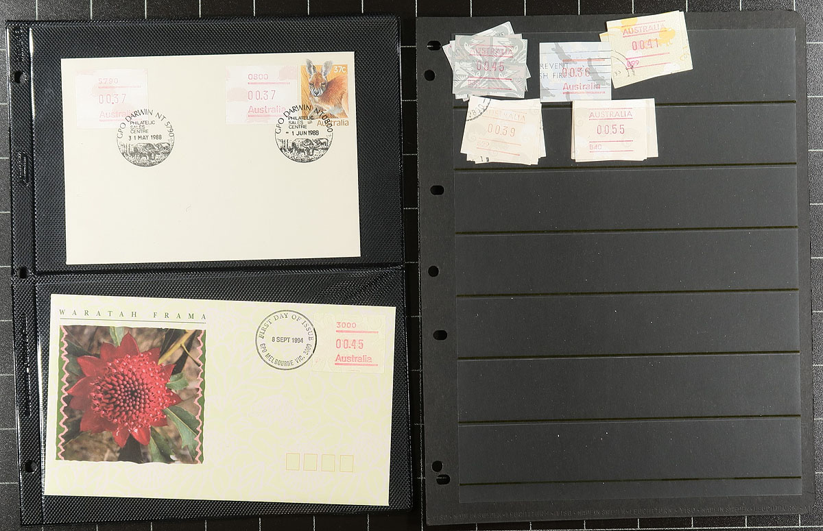 Comprehensive collection of 1984-1999 issue FRAMA labels, all neatly mounted on Seven Seas album pages within a deluxe Seven Seas padded album with slipcase (cost of the album alone well over $100.00). Consists of 212 mint and used labels and 40 covers, all between Seven Seas catalogue #912b // 1736bs. The odd missing stamp noted, but largely complete for the period These are an often overlooked yet still essential part of any Australian collection. Older 2002 Seven Seas catalogue over AUD$590.50 ($536.50 CDN), plus the high-quality album. Estimate =