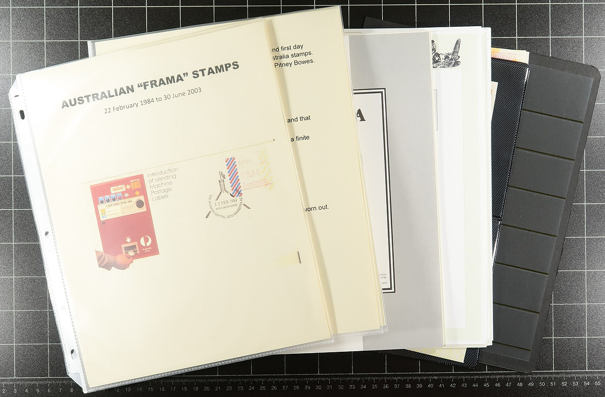 Comprehensive collection of 1984-1999 issue FRAMA labels, all neatly mounted on Seven Seas album pages within a deluxe Seven Seas padded album with slipcase (cost of the album alone well over $100.00). Consists of 212 mint and used labels and 40 covers, all between Seven Seas catalogue #912b // 1736bs. The odd missing stamp noted, but largely complete for the period These are an often overlooked yet still essential part of any Australian collection. Older 2002 Seven Seas catalogue over AUD$590.50 ($536.50 CDN), plus the high-quality album. Estimate =