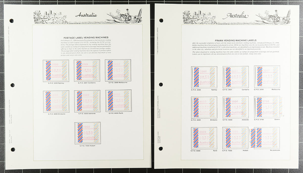 Comprehensive collection of 1984-1999 issue FRAMA labels, all neatly mounted on Seven Seas album pages within a deluxe Seven Seas padded album with slipcase (cost of the album alone well over $100.00). Consists of 212 mint and used labels and 40 covers, all between Seven Seas catalogue #912b // 1736bs. The odd missing stamp noted, but largely complete for the period These are an often overlooked yet still essential part of any Australian collection. Older 2002 Seven Seas catalogue over AUD$590.50 ($536.50 CDN), plus the high-quality album. Estimate =