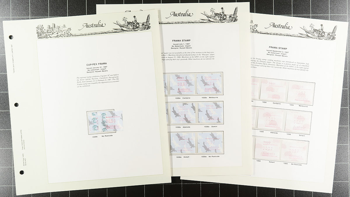 Comprehensive collection of 1984-1999 issue FRAMA labels, all neatly mounted on Seven Seas album pages within a deluxe Seven Seas padded album with slipcase (cost of the album alone well over $100.00). Consists of 212 mint and used labels and 40 covers, all between Seven Seas catalogue #912b // 1736bs. The odd missing stamp noted, but largely complete for the period These are an often overlooked yet still essential part of any Australian collection. Older 2002 Seven Seas catalogue over AUD$590.50 ($536.50 CDN), plus the high-quality album. Estimate =