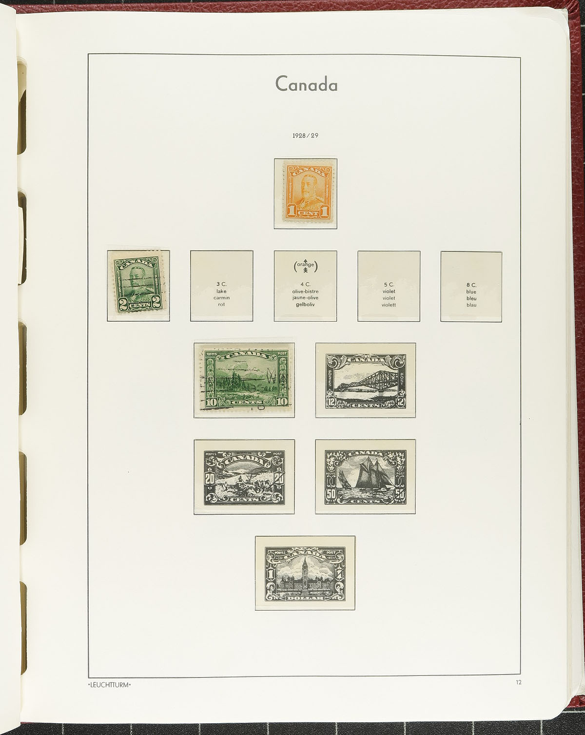 The "old style" Lighthouse Hingeless album, with pages from 1851-1977 plus "back of the book" containing a smattering of mint / used starting in the Small Queen period and including "Maps", Tercentenary 7c, Admirals etc, staying mostly used til the early 1950's then transitioning to mostly mint thereafter. An excellent "starter" to a Canadian collection, held in a premium album. Estimate =