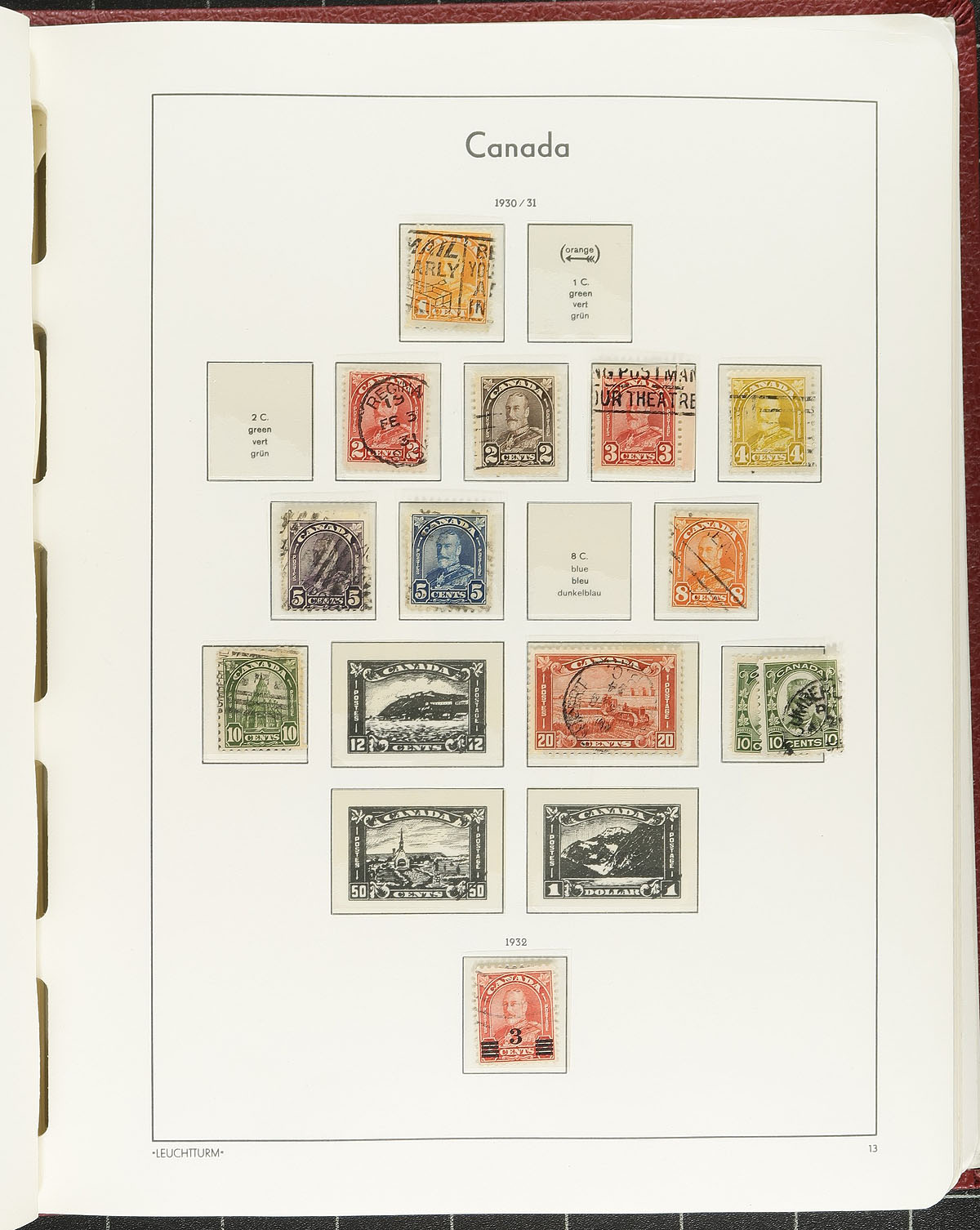 The "old style" Lighthouse Hingeless album, with pages from 1851-1977 plus "back of the book" containing a smattering of mint / used starting in the Small Queen period and including "Maps", Tercentenary 7c, Admirals etc, staying mostly used til the early 1950's then transitioning to mostly mint thereafter. An excellent "starter" to a Canadian collection, held in a premium album. Estimate =