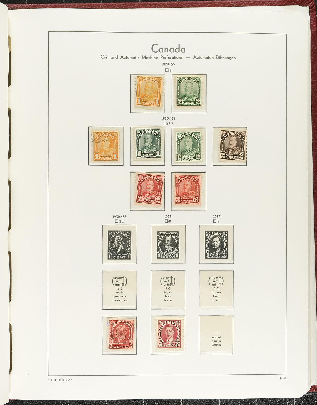 The "old style" Lighthouse Hingeless album, with pages from 1851-1977 plus "back of the book" containing a smattering of mint / used starting in the Small Queen period and including "Maps", Tercentenary 7c, Admirals etc, staying mostly used til the early 1950's then transitioning to mostly mint thereafter. An excellent "starter" to a Canadian collection, held in a premium album. Estimate =