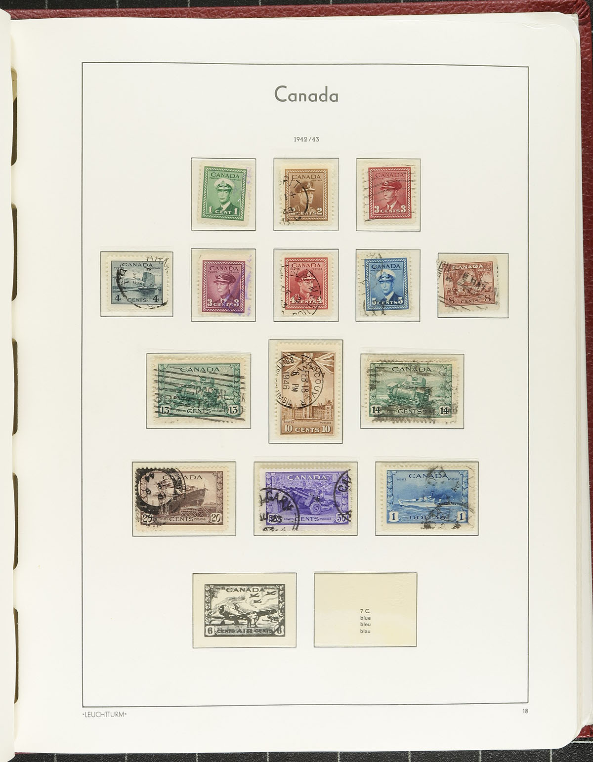 The "old style" Lighthouse Hingeless album, with pages from 1851-1977 plus "back of the book" containing a smattering of mint / used starting in the Small Queen period and including "Maps", Tercentenary 7c, Admirals etc, staying mostly used til the early 1950's then transitioning to mostly mint thereafter. An excellent "starter" to a Canadian collection, held in a premium album. Estimate =