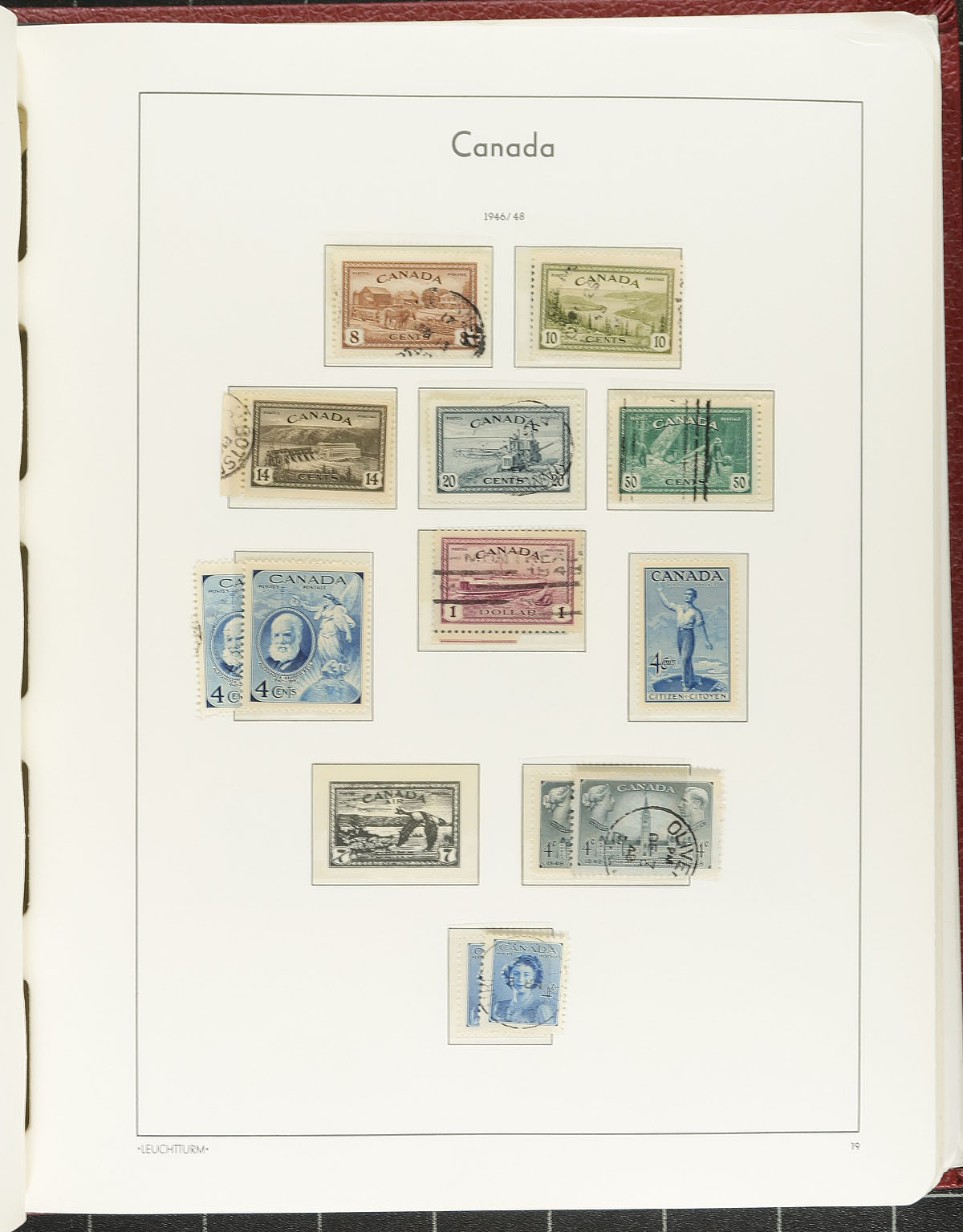 The "old style" Lighthouse Hingeless album, with pages from 1851-1977 plus "back of the book" containing a smattering of mint / used starting in the Small Queen period and including "Maps", Tercentenary 7c, Admirals etc, staying mostly used til the early 1950's then transitioning to mostly mint thereafter. An excellent "starter" to a Canadian collection, held in a premium album. Estimate =