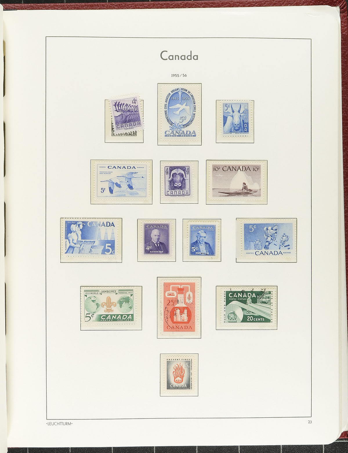 The "old style" Lighthouse Hingeless album, with pages from 1851-1977 plus "back of the book" containing a smattering of mint / used starting in the Small Queen period and including "Maps", Tercentenary 7c, Admirals etc, staying mostly used til the early 1950's then transitioning to mostly mint thereafter. An excellent "starter" to a Canadian collection, held in a premium album. Estimate =