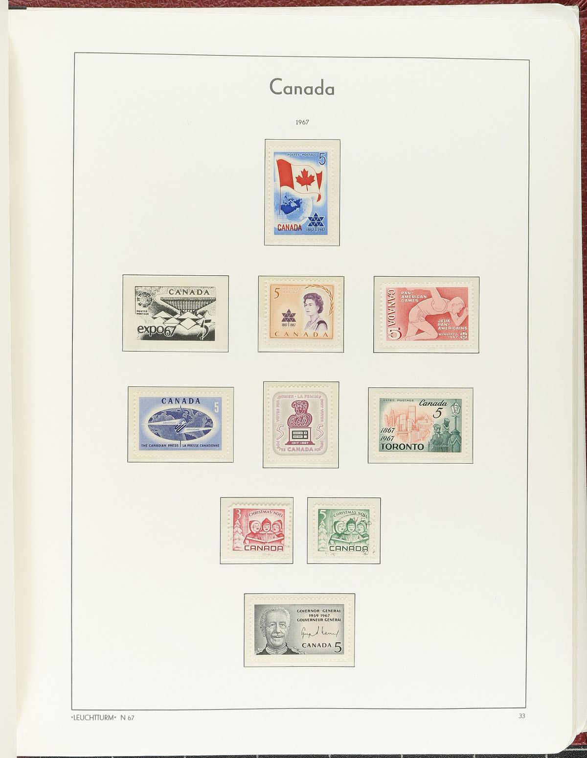 The "old style" Lighthouse Hingeless album, with pages from 1851-1977 plus "back of the book" containing a smattering of mint / used starting in the Small Queen period and including "Maps", Tercentenary 7c, Admirals etc, staying mostly used til the early 1950's then transitioning to mostly mint thereafter. An excellent "starter" to a Canadian collection, held in a premium album. Estimate =