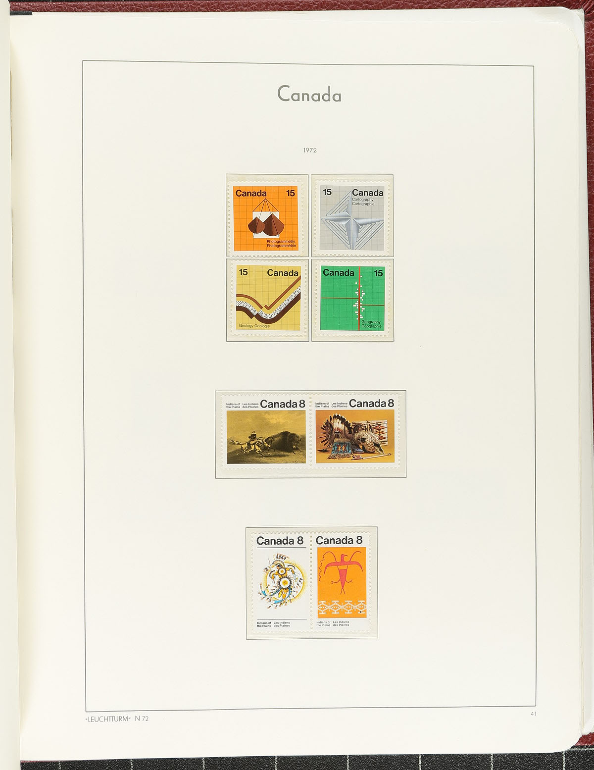 The "old style" Lighthouse Hingeless album, with pages from 1851-1977 plus "back of the book" containing a smattering of mint / used starting in the Small Queen period and including "Maps", Tercentenary 7c, Admirals etc, staying mostly used til the early 1950's then transitioning to mostly mint thereafter. An excellent "starter" to a Canadian collection, held in a premium album. Estimate =