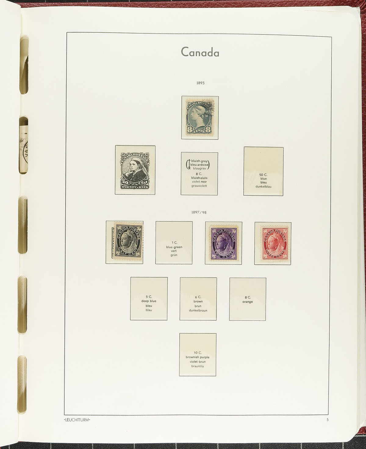 The "old style" Lighthouse Hingeless album, with pages from 1851-1977 plus "back of the book" containing a smattering of mint / used starting in the Small Queen period and including "Maps", Tercentenary 7c, Admirals etc, staying mostly used til the early 1950's then transitioning to mostly mint thereafter. An excellent "starter" to a Canadian collection, held in a premium album. Estimate =