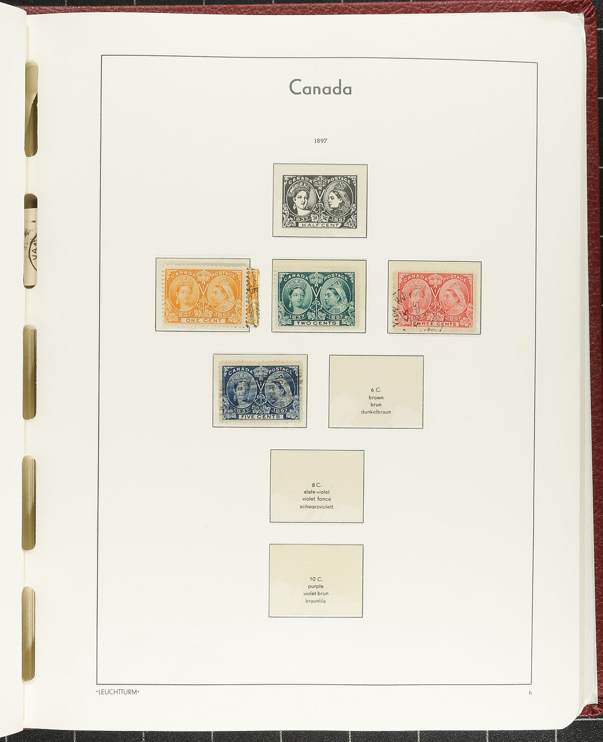 The "old style" Lighthouse Hingeless album, with pages from 1851-1977 plus "back of the book" containing a smattering of mint / used starting in the Small Queen period and including "Maps", Tercentenary 7c, Admirals etc, staying mostly used til the early 1950's then transitioning to mostly mint thereafter. An excellent "starter" to a Canadian collection, held in a premium album. Estimate =