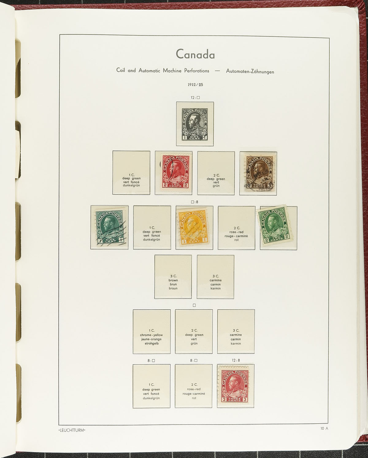 The "old style" Lighthouse Hingeless album, with pages from 1851-1977 plus "back of the book" containing a smattering of mint / used starting in the Small Queen period and including "Maps", Tercentenary 7c, Admirals etc, staying mostly used til the early 1950's then transitioning to mostly mint thereafter. An excellent "starter" to a Canadian collection, held in a premium album. Estimate =