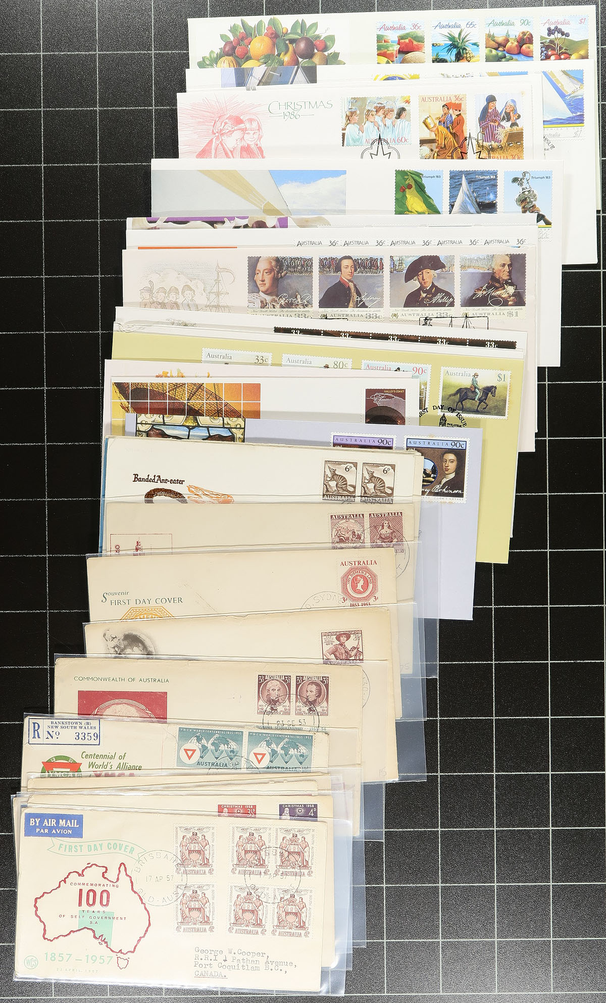 First Day Covers. Bundle of over 200 cachet first day covers from 1946-1987, about 40% with private cachets. The early FDC are from an assortment of cachet makers, including some very nice cachets , transitioning to the 1980's which are mostly Fleetwood cachets and the balance are Australia Post cachets. The early FDCs and a few from the 1980's are addressed, but most are unaddressed. Overall condition is quite good, with only a few duplicates noted. Based on the penciled pricing on a few covers, these haven’t seen the light of day in over 30 years. Substantial catalogue value in Seven Seas. Estimate =