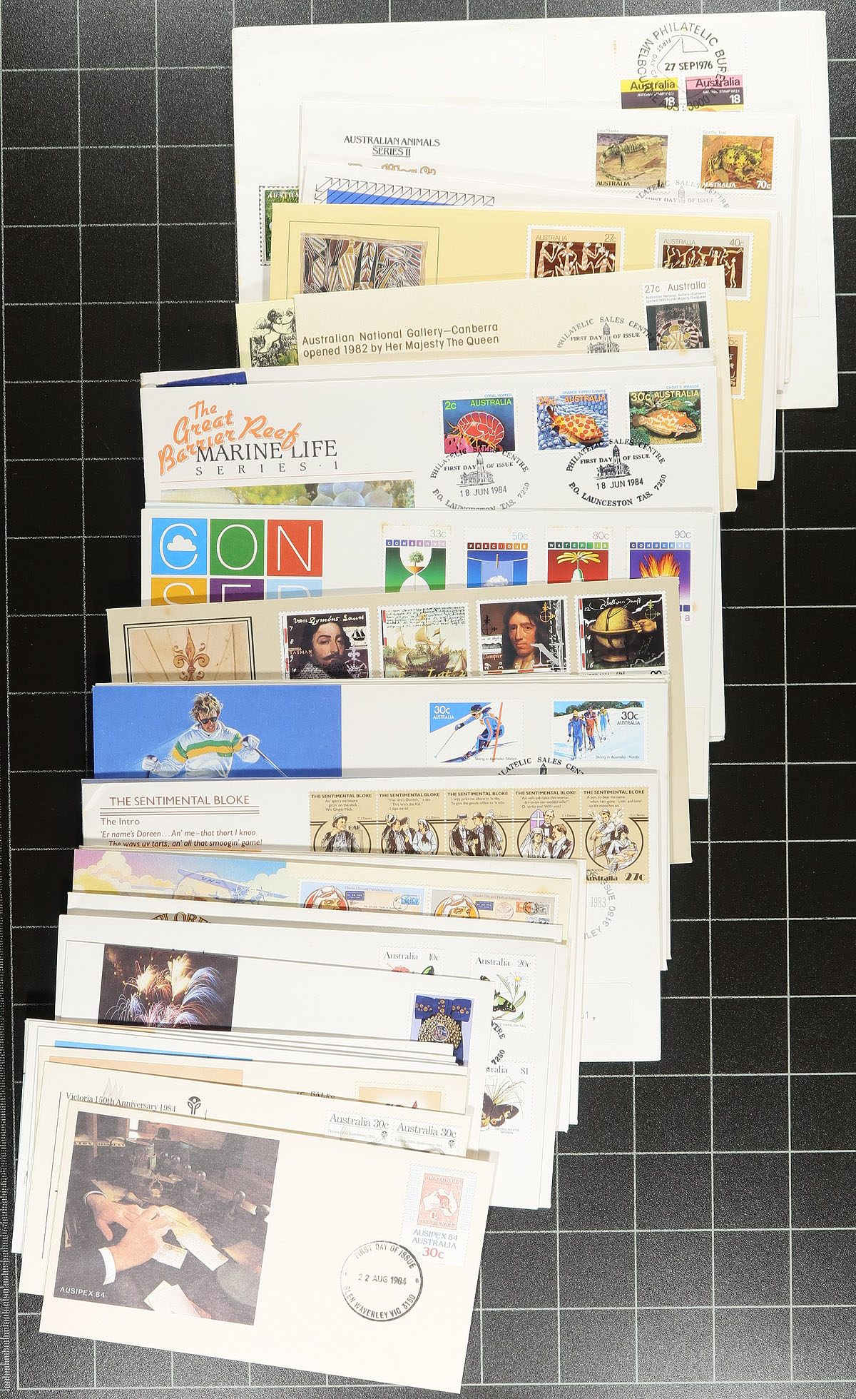 First Day Covers. Bundle of over 200 cachet first day covers from 1946-1987, about 40% with private cachets. The early FDC are from an assortment of cachet makers, including some very nice cachets , transitioning to the 1980's which are mostly Fleetwood cachets and the balance are Australia Post cachets. The early FDCs and a few from the 1980's are addressed, but most are unaddressed. Overall condition is quite good, with only a few duplicates noted. Based on the penciled pricing on a few covers, these haven’t seen the light of day in over 30 years. Substantial catalogue value in Seven Seas. Estimate =