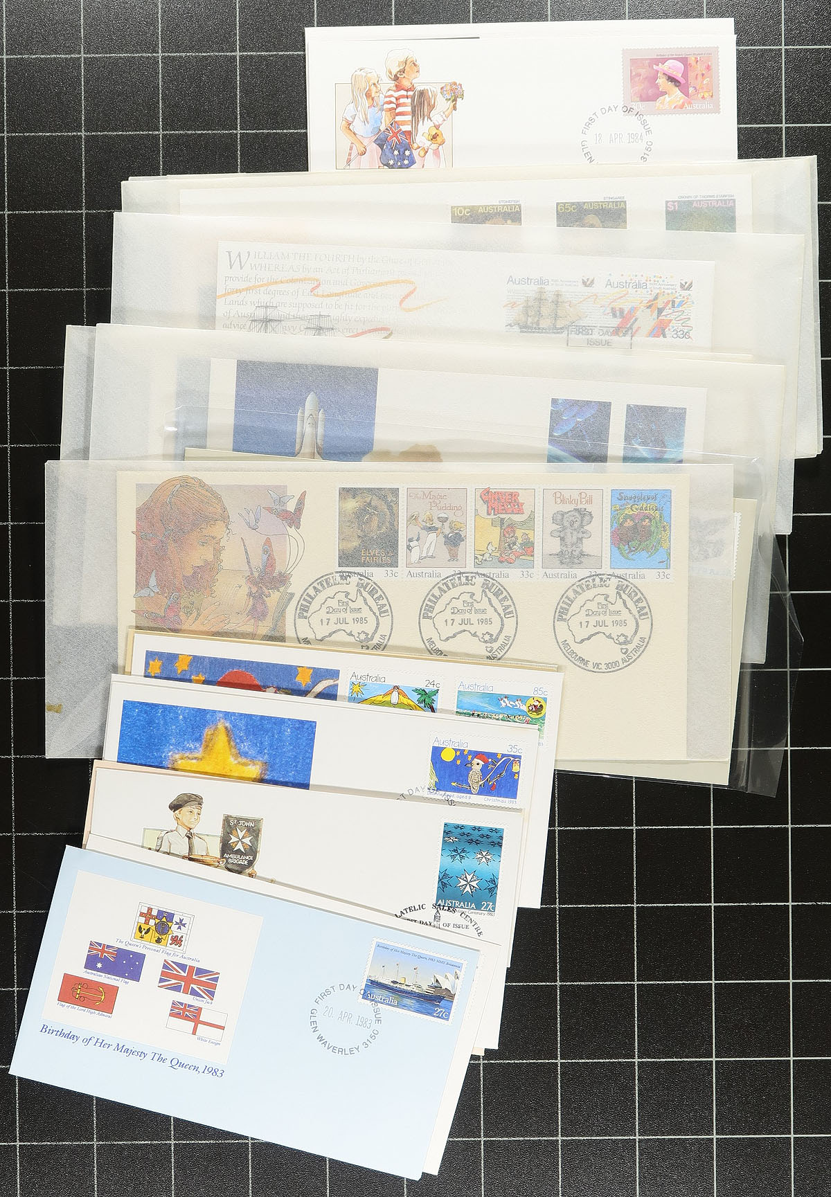First Day Covers. Bundle of over 200 cachet first day covers from 1946-1987, about 40% with private cachets. The early FDC are from an assortment of cachet makers, including some very nice cachets , transitioning to the 1980's which are mostly Fleetwood cachets and the balance are Australia Post cachets. The early FDCs and a few from the 1980's are addressed, but most are unaddressed. Overall condition is quite good, with only a few duplicates noted. Based on the penciled pricing on a few covers, these haven’t seen the light of day in over 30 years. Substantial catalogue value in Seven Seas. Estimate =