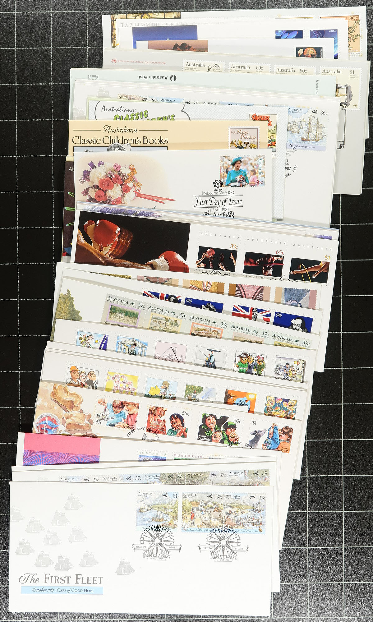 First Day Covers. Bundle of over 200 cachet first day covers from 1946-1987, about 40% with private cachets. The early FDC are from an assortment of cachet makers, including some very nice cachets , transitioning to the 1980's which are mostly Fleetwood cachets and the balance are Australia Post cachets. The early FDCs and a few from the 1980's are addressed, but most are unaddressed. Overall condition is quite good, with only a few duplicates noted. Based on the penciled pricing on a few covers, these haven’t seen the light of day in over 30 years. Substantial catalogue value in Seven Seas. Estimate =
