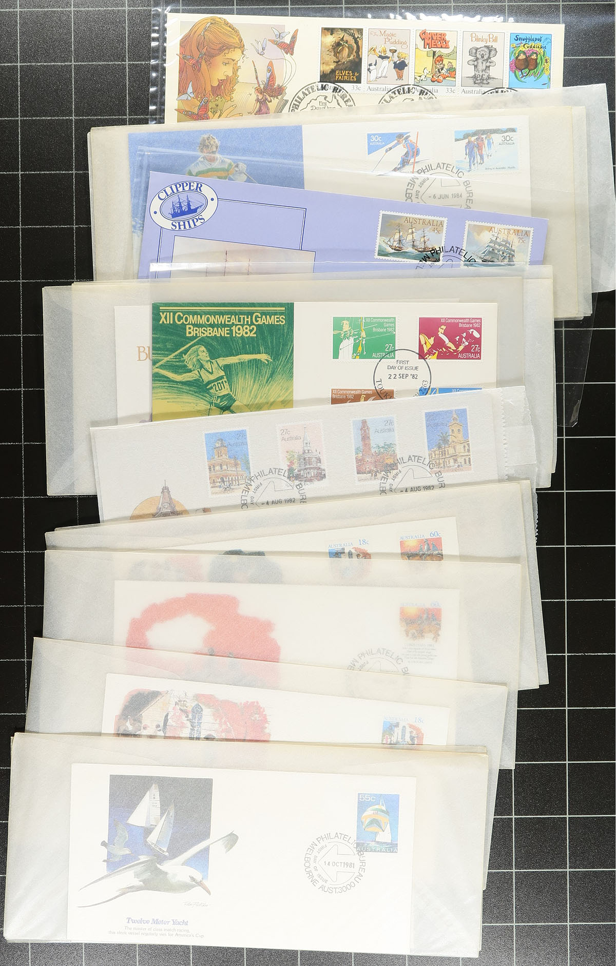 First Day Covers. Bundle of over 200 cachet first day covers from 1946-1987, about 40% with private cachets. The early FDC are from an assortment of cachet makers, including some very nice cachets , transitioning to the 1980's which are mostly Fleetwood cachets and the balance are Australia Post cachets. The early FDCs and a few from the 1980's are addressed, but most are unaddressed. Overall condition is quite good, with only a few duplicates noted. Based on the penciled pricing on a few covers, these haven’t seen the light of day in over 30 years. Substantial catalogue value in Seven Seas. Estimate =