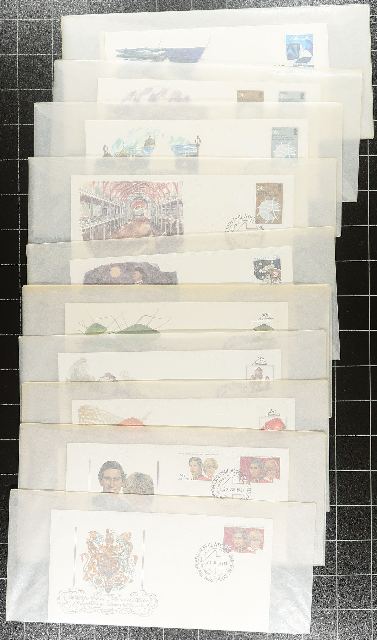 First Day Covers. Bundle of over 200 cachet first day covers from 1946-1987, about 40% with private cachets. The early FDC are from an assortment of cachet makers, including some very nice cachets , transitioning to the 1980's which are mostly Fleetwood cachets and the balance are Australia Post cachets. The early FDCs and a few from the 1980's are addressed, but most are unaddressed. Overall condition is quite good, with only a few duplicates noted. Based on the penciled pricing on a few covers, these haven’t seen the light of day in over 30 years. Substantial catalogue value in Seven Seas. Estimate =