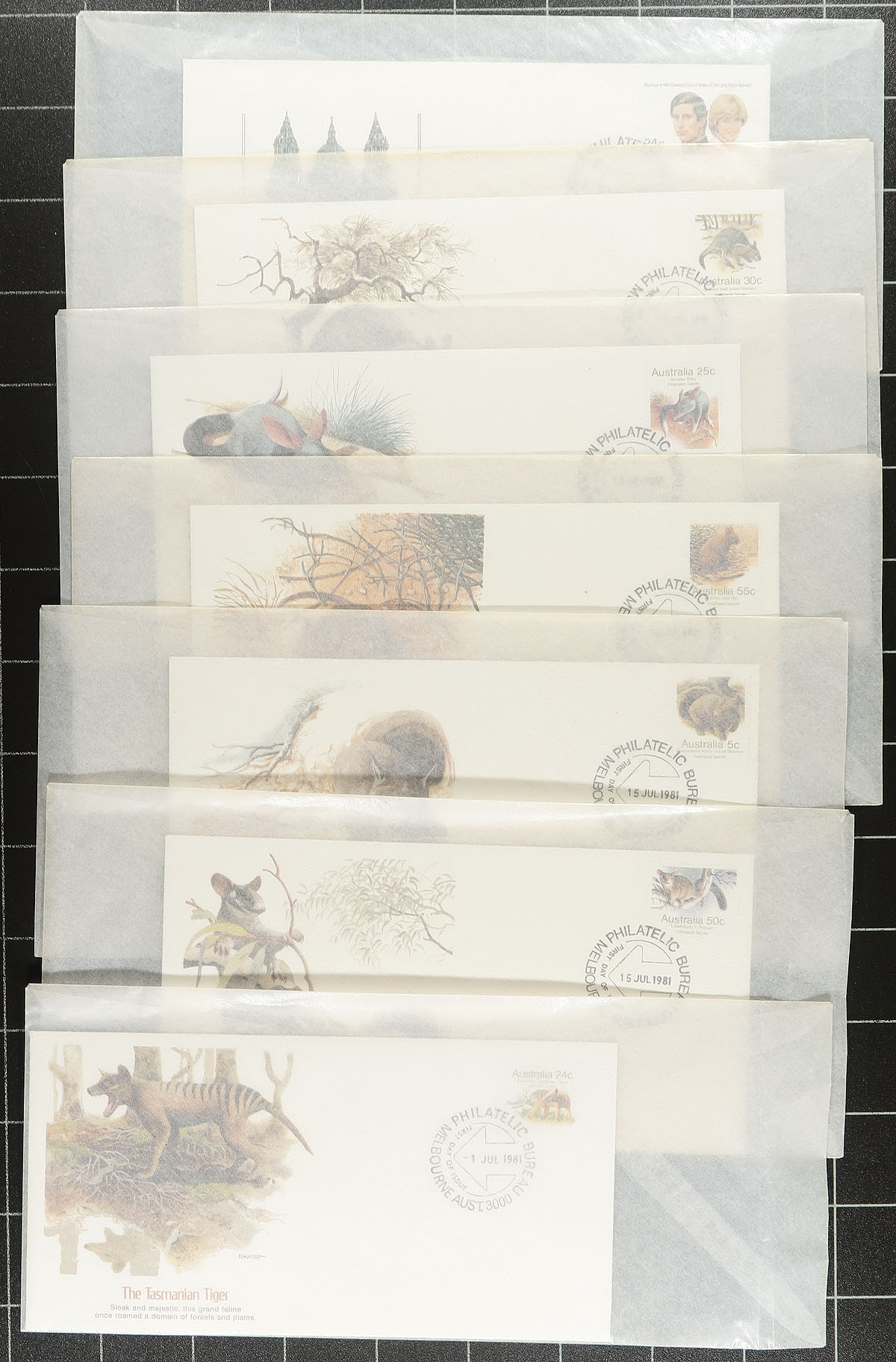 First Day Covers. Bundle of over 200 cachet first day covers from 1946-1987, about 40% with private cachets. The early FDC are from an assortment of cachet makers, including some very nice cachets , transitioning to the 1980's which are mostly Fleetwood cachets and the balance are Australia Post cachets. The early FDCs and a few from the 1980's are addressed, but most are unaddressed. Overall condition is quite good, with only a few duplicates noted. Based on the penciled pricing on a few covers, these haven’t seen the light of day in over 30 years. Substantial catalogue value in Seven Seas. Estimate =