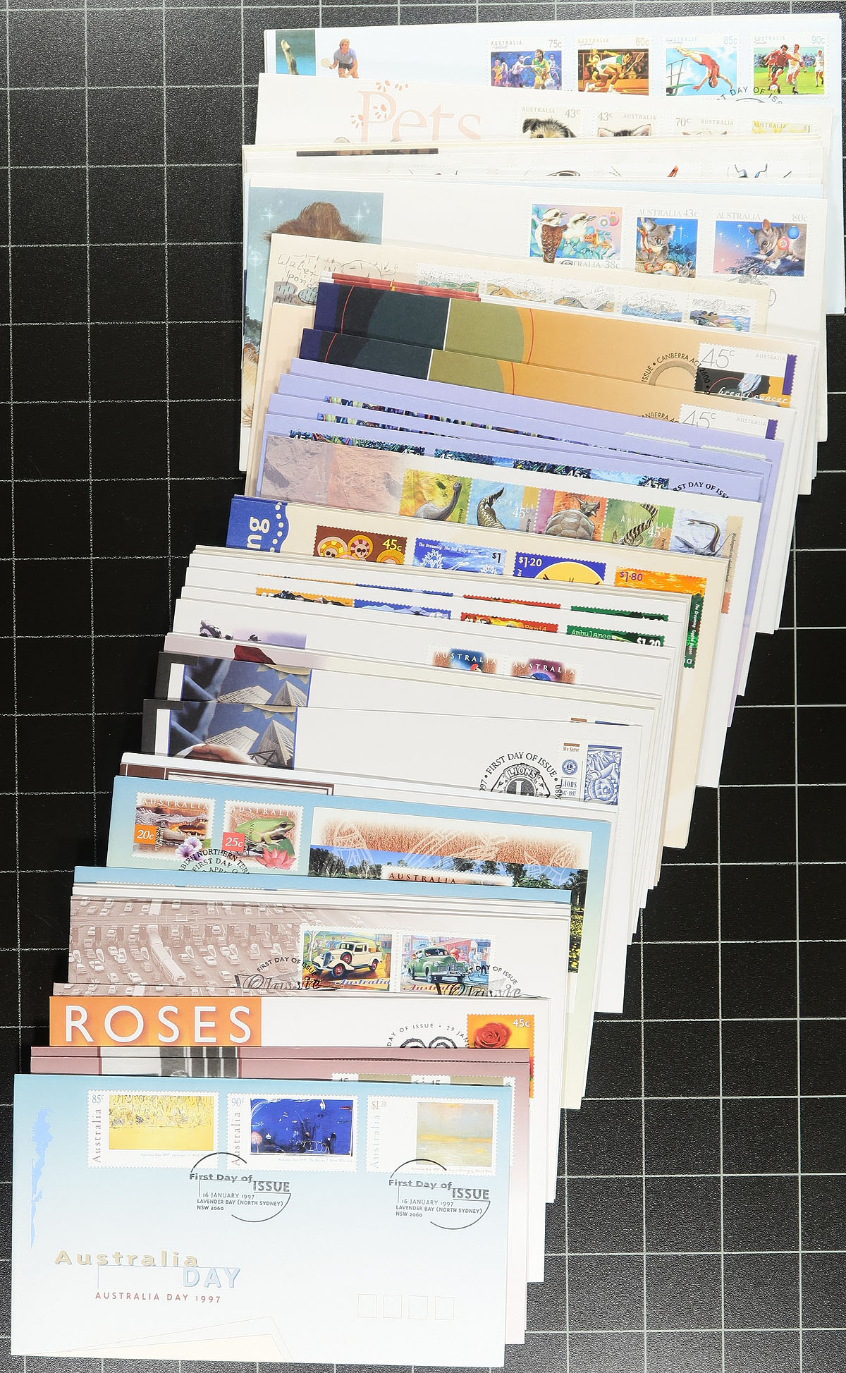 First Day Covers. A bundle of over 250, mostly different and 90% unaddressed Australia Post cachets from 1983-2000, with strong coverage in a few areas (e.g. 1995, 1997, 2000) including better values (saw the $10 "Devil’s Marbles" issue). Includes some souvenir sheets and a bit of Antarctic Territory, Frama, etc. A touch of duplication. A few of the early 1980's covers have minor tone spots. Substantial original cost and current catalogue value. Estimate =