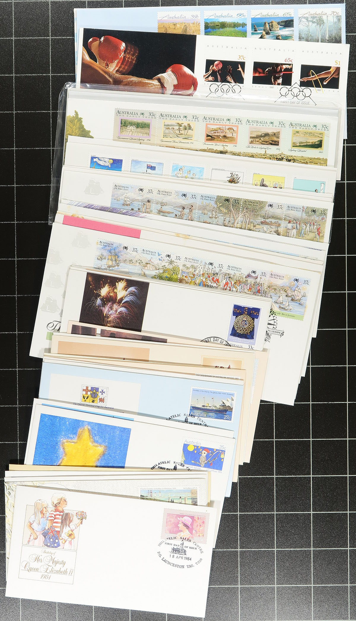 First Day Covers. A bundle of over 250, mostly different and 90% unaddressed Australia Post cachets from 1983-2000, with strong coverage in a few areas (e.g. 1995, 1997, 2000) including better values (saw the $10 "Devil’s Marbles" issue). Includes some souvenir sheets and a bit of Antarctic Territory, Frama, etc. A touch of duplication. A few of the early 1980's covers have minor tone spots. Substantial original cost and current catalogue value. Estimate =