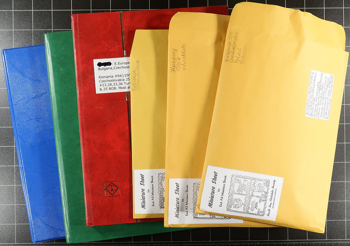 Eastern European bundle noting Bulgaria, Czechoslovakia, Estonia, Hungary, Poland, Romania and more! There are two 16-page stockbooks a binder of manila stockpages with a wide assortment of issues (more used than mint) plus three dealer envelopes with significant quantities of souvenir sheets. The catalogue value here will stretch to over $1000.00. Estimate =