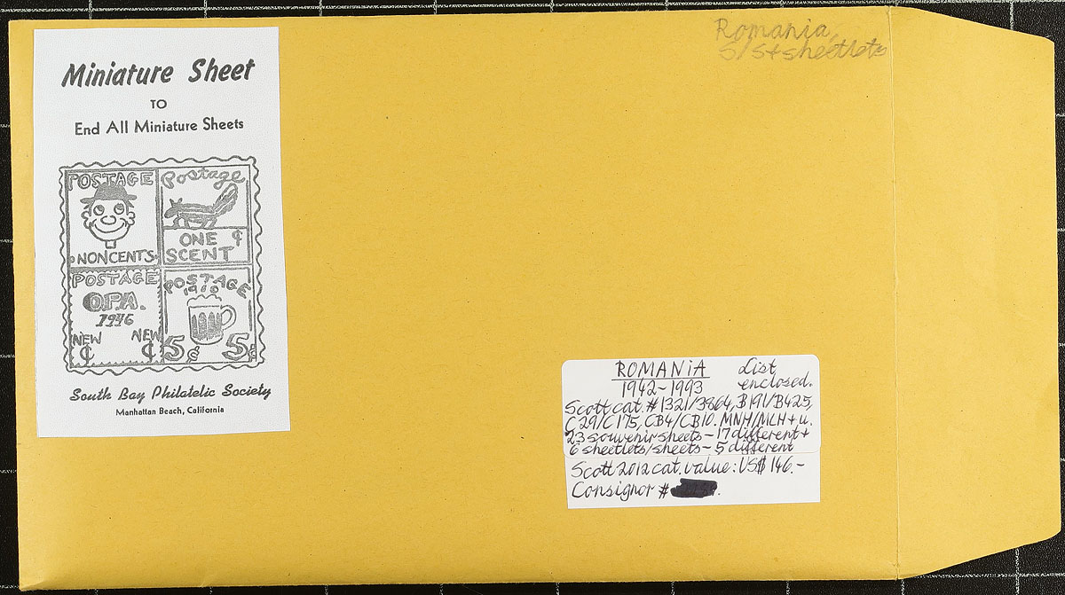 Eastern European bundle noting Bulgaria, Czechoslovakia, Estonia, Hungary, Poland, Romania and more! There are two 16-page stockbooks a binder of manila stockpages with a wide assortment of issues (more used than mint) plus three dealer envelopes with significant quantities of souvenir sheets. The catalogue value here will stretch to over $1000.00. Estimate =