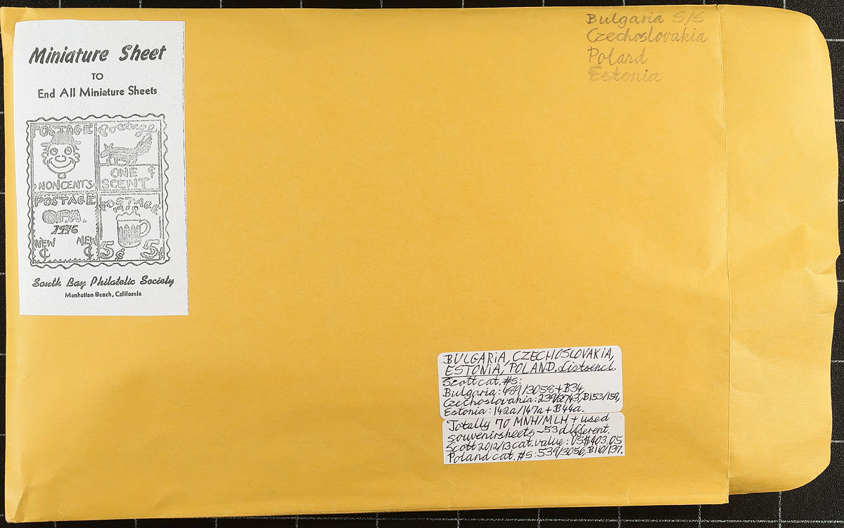 Eastern European bundle noting Bulgaria, Czechoslovakia, Estonia, Hungary, Poland, Romania and more! There are two 16-page stockbooks a binder of manila stockpages with a wide assortment of issues (more used than mint) plus three dealer envelopes with significant quantities of souvenir sheets. The catalogue value here will stretch to over $1000.00. Estimate =