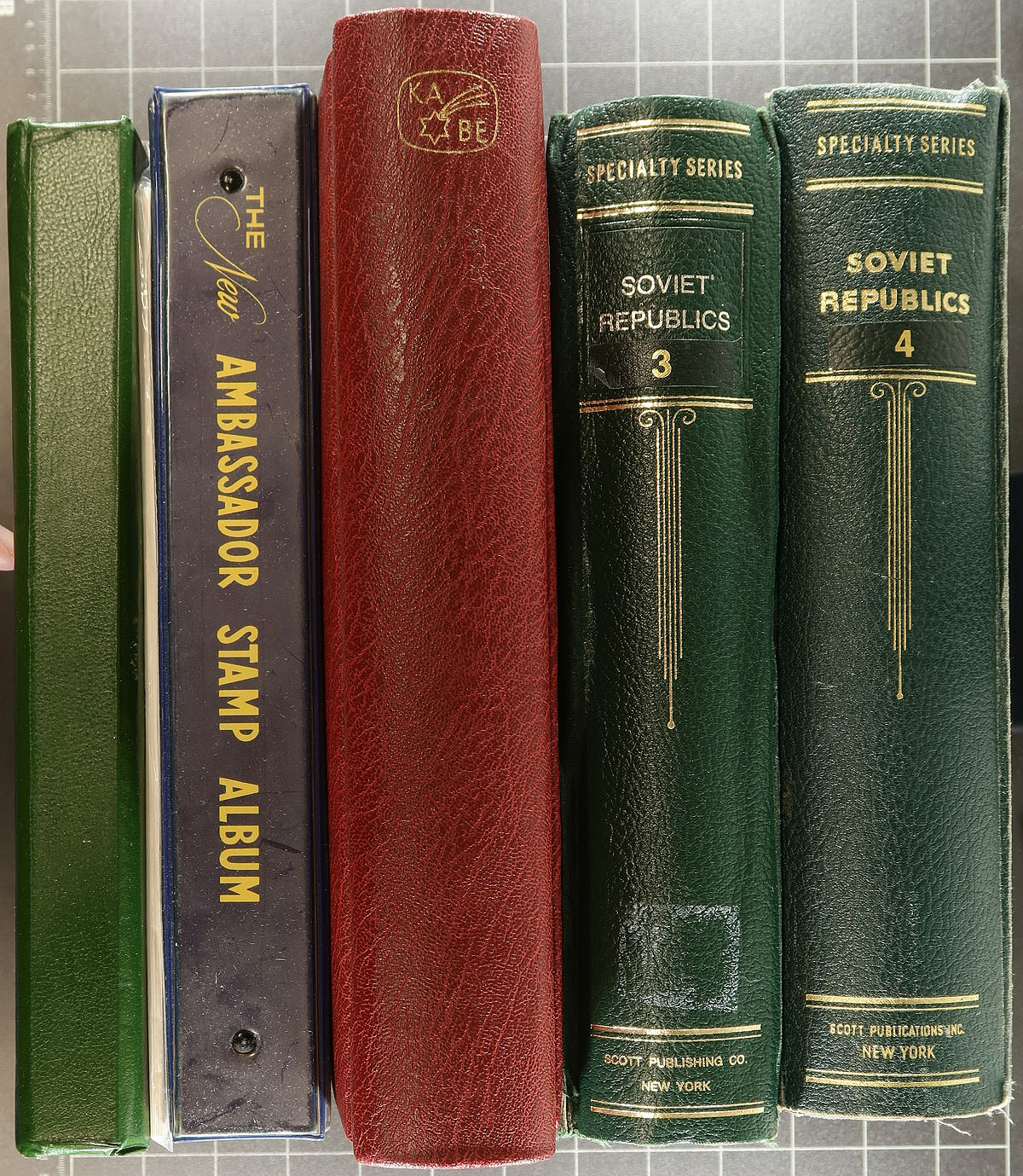 A holding of albums and stamps. The albums may have the most value in this banker’s box. There are two green 2-post Scott Specialty albums covering 1969-1991 with regular pages with (poorly) added black mounts - which likely can be replaced by a patient collector (binders worth about $100.00). The next album is a Ka-Be brand album with hingeless pages covering 1992-2002 in a magnificent, generic springback binder (the retail on the album and pages is likely over $500.00 if you can find them!). Both albums have no stamps. Fortunately, the rest of the lot can help with that, noting a group of 1952-1957 Minkus pages with 174 used stamps (cat around $150.00). A large stockbook has a wholesale accumulation of mint 1970's-1990's sets and souvenir sheets (catalogue around $300.00), finishing with a 20th century collection of used on Harris pages and a small stockbook of mint 1960's issues. Estimate =