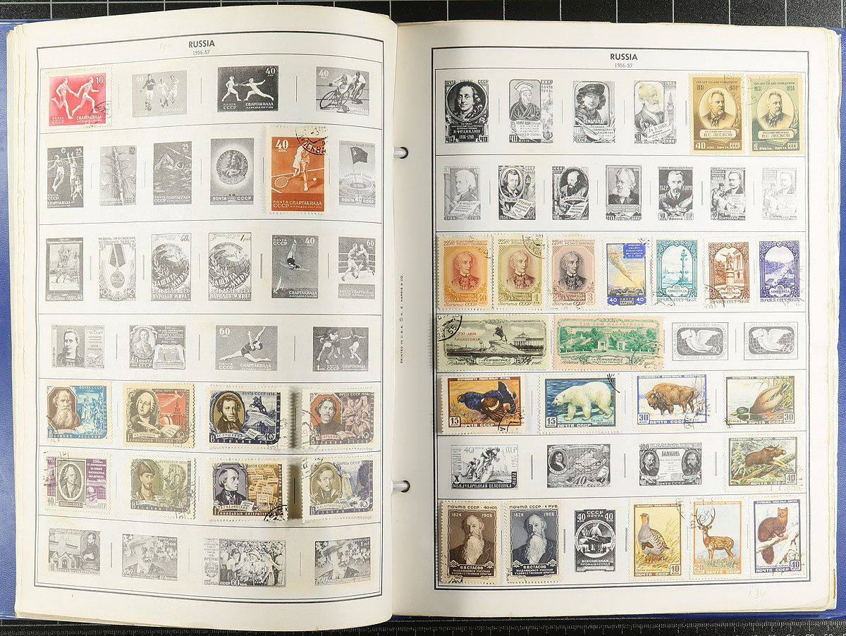 A holding of albums and stamps. The albums may have the most value in this banker’s box. There are two green 2-post Scott Specialty albums covering 1969-1991 with regular pages with (poorly) added black mounts - which likely can be replaced by a patient collector (binders worth about $100.00). The next album is a Ka-Be brand album with hingeless pages covering 1992-2002 in a magnificent, generic springback binder (the retail on the album and pages is likely over $500.00 if you can find them!). Both albums have no stamps. Fortunately, the rest of the lot can help with that, noting a group of 1952-1957 Minkus pages with 174 used stamps (cat around $150.00). A large stockbook has a wholesale accumulation of mint 1970's-1990's sets and souvenir sheets (catalogue around $300.00), finishing with a 20th century collection of used on Harris pages and a small stockbook of mint 1960's issues. Estimate =