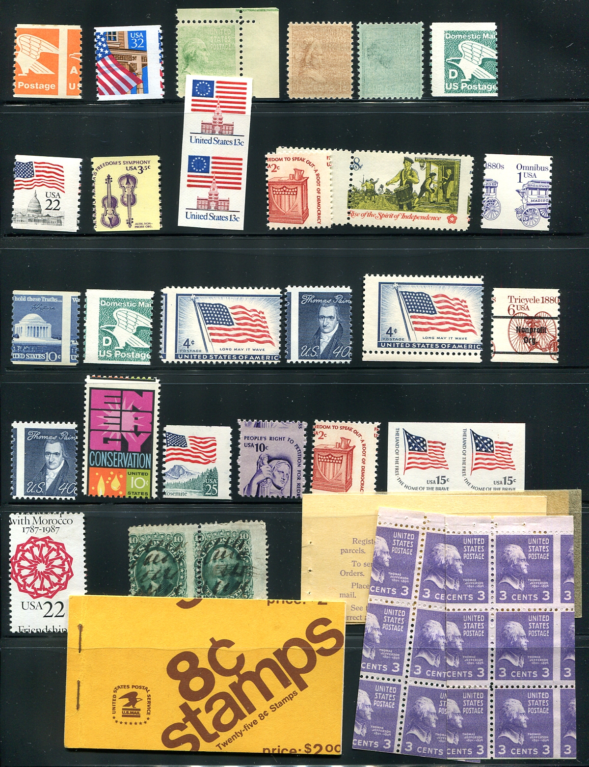 Varieties of many shapes and forms, two pages of mostly mint, with a few used. Includes mis-perforations, mis-cuts, "ghost" printings, imperforate pairs, offsets, ink blotches, reverse order printing (on France "Overrun nations", a "Holmes" sealed booklet with only one pane (instead of three). An easy way to spice up the eye-appeal of your modern USA collection. Estimated value =
