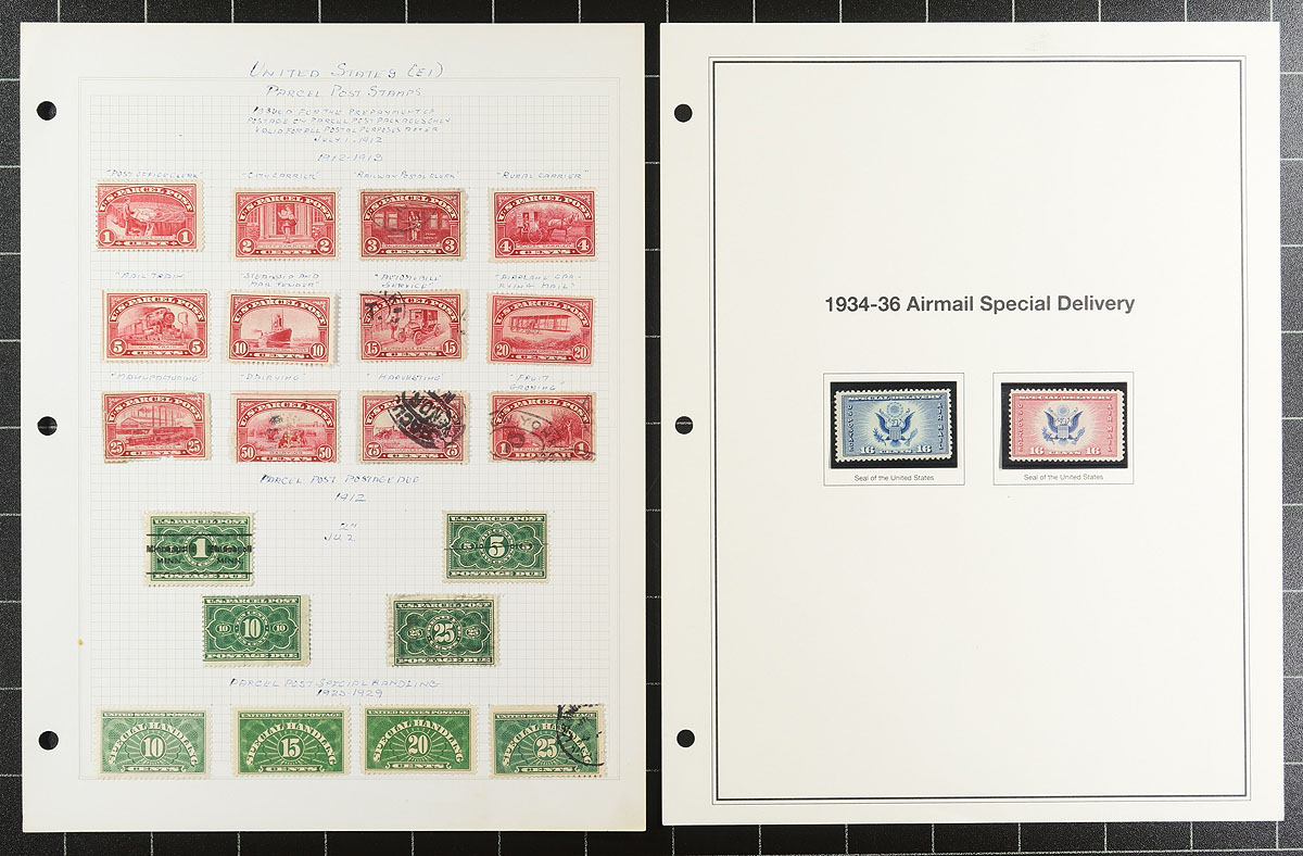 A "back of the book" mint and used holding, the balance of an estate. There is an assortment of mounted pages and a couple of stockpages. Besides the standard airmail (with a Lindberg booklet pane), postage due (including some nice mint red dues), special delivery issues, there is some revenues, coil testing pairs, postal savings stamps, precancels, even a couple of minor errors. Some significant catalogue value here, and other value possibilities there, make this an interesting lot. Estimate =