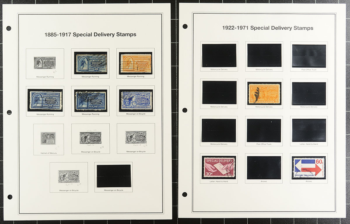 A "back of the book" mint and used holding, the balance of an estate. There is an assortment of mounted pages and a couple of stockpages. Besides the standard airmail (with a Lindberg booklet pane), postage due (including some nice mint red dues), special delivery issues, there is some revenues, coil testing pairs, postal savings stamps, precancels, even a couple of minor errors. Some significant catalogue value here, and other value possibilities there, make this an interesting lot. Estimate =