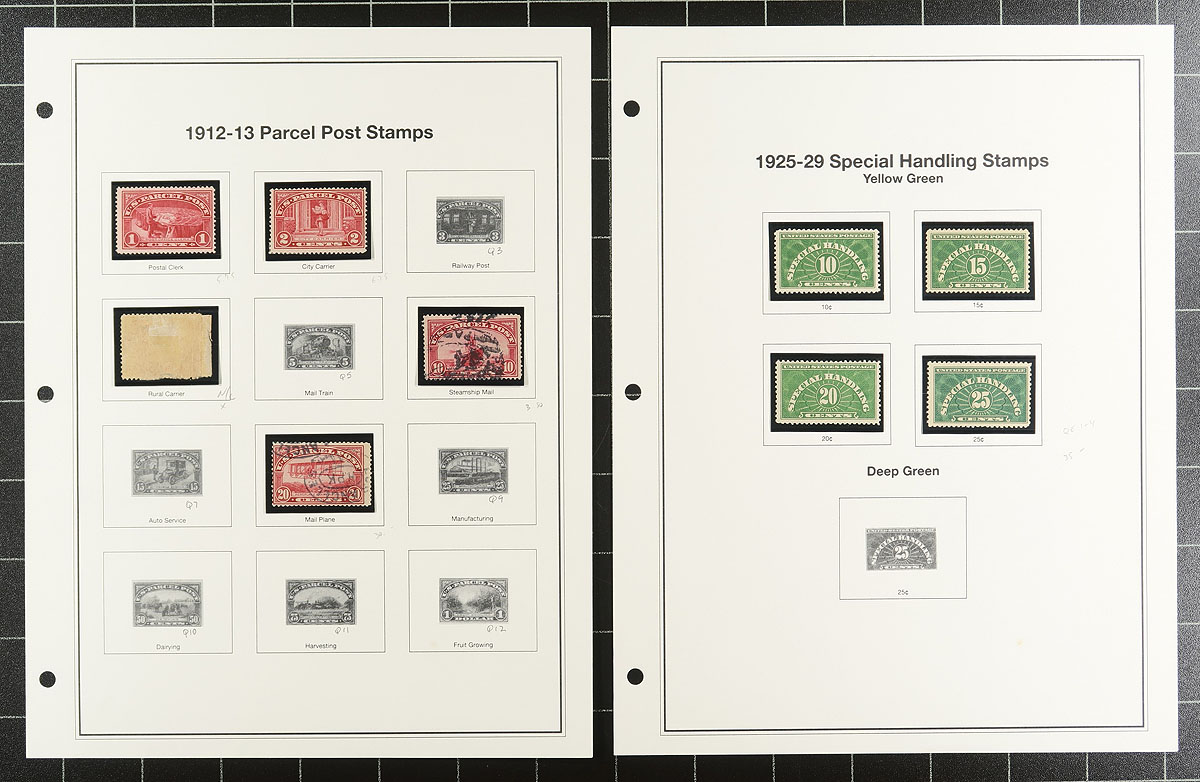 A "back of the book" mint and used holding, the balance of an estate. There is an assortment of mounted pages and a couple of stockpages. Besides the standard airmail (with a Lindberg booklet pane), postage due (including some nice mint red dues), special delivery issues, there is some revenues, coil testing pairs, postal savings stamps, precancels, even a couple of minor errors. Some significant catalogue value here, and other value possibilities there, make this an interesting lot. Estimate =