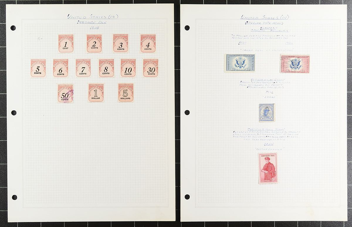 A "back of the book" mint and used holding, the balance of an estate. There is an assortment of mounted pages and a couple of stockpages. Besides the standard airmail (with a Lindberg booklet pane), postage due (including some nice mint red dues), special delivery issues, there is some revenues, coil testing pairs, postal savings stamps, precancels, even a couple of minor errors. Some significant catalogue value here, and other value possibilities there, make this an interesting lot. Estimate =