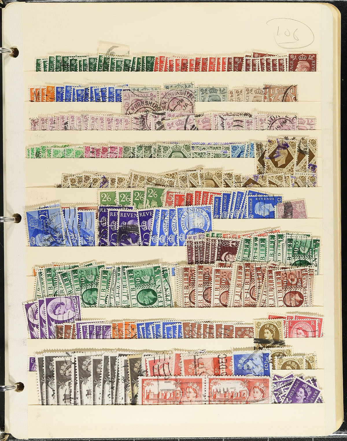A dozen albums, binders, clutches/bundles of mostly used material from the late Victorian era to about 2012. Includes collections, accumulations, unsorted material, with mild to heavy duplication. While there is a bit of better earlier items, the majority are KGVI-QEII, with only a bit of Machin and only a bit of Regional material. There are volumes which are all definitives, others which are all commemoratives. From several different sources, each of these volumes were once a bidboard at a BC auction house, but the collector never got around to sorting these out. There are thousands of stamps and plenty of catalogue value here. There could be better items sitting here awaiting discovery, and you will have hours of fun looking. Fills a bankers box to its limit. Estimate =