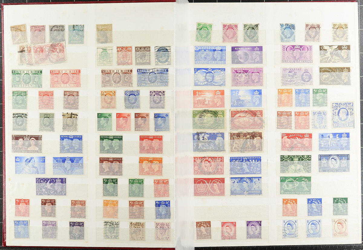 A dozen albums, binders, clutches/bundles of mostly used material from the late Victorian era to about 2012. Includes collections, accumulations, unsorted material, with mild to heavy duplication. While there is a bit of better earlier items, the majority are KGVI-QEII, with only a bit of Machin and only a bit of Regional material. There are volumes which are all definitives, others which are all commemoratives. From several different sources, each of these volumes were once a bidboard at a BC auction house, but the collector never got around to sorting these out. There are thousands of stamps and plenty of catalogue value here. There could be better items sitting here awaiting discovery, and you will have hours of fun looking. Fills a bankers box to its limit. Estimate =