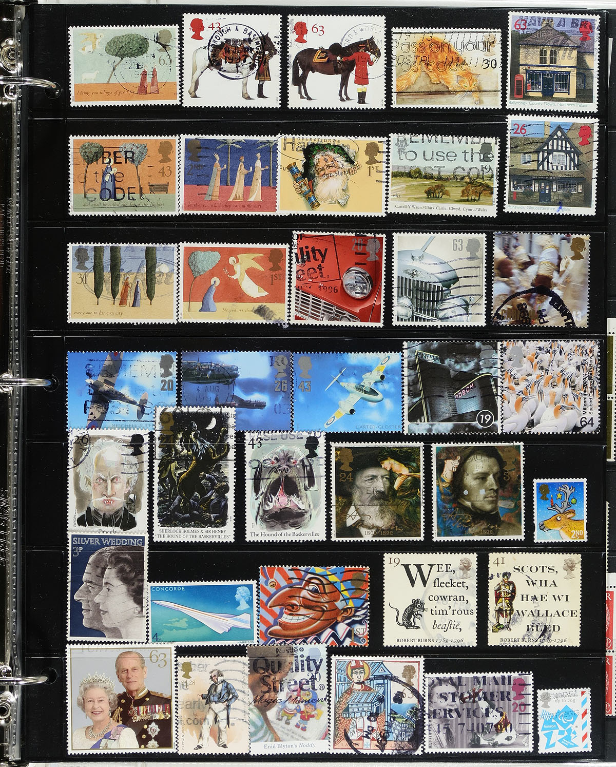 A dozen albums, binders, clutches/bundles of mostly used material from the late Victorian era to about 2012. Includes collections, accumulations, unsorted material, with mild to heavy duplication. While there is a bit of better earlier items, the majority are KGVI-QEII, with only a bit of Machin and only a bit of Regional material. There are volumes which are all definitives, others which are all commemoratives. From several different sources, each of these volumes were once a bidboard at a BC auction house, but the collector never got around to sorting these out. There are thousands of stamps and plenty of catalogue value here. There could be better items sitting here awaiting discovery, and you will have hours of fun looking. Fills a bankers box to its limit. Estimate =