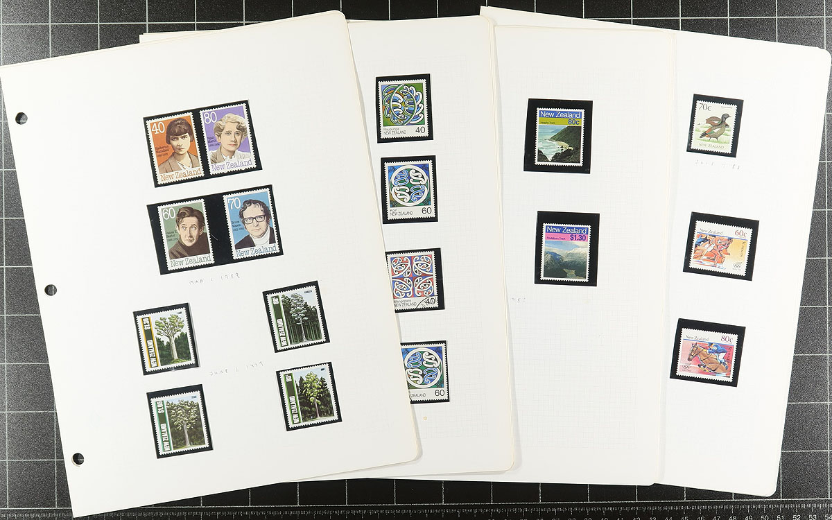 1960's-1990's mint and used collection (sometimes mint, sometimes used, sometimes both). All neatly mounted in black mounts on quadrilled pages. Quite complete throughout this time period (there is a bit of earlier 20th century, which we have not counted). Better mint includes £1 pink geyser, 2 sets of the $4-$10 "Arms", some blocks, better values such as the $10 Kiwi, a couple of complete booklets and even a bit of Tokelau and Ross Dependency, but no "health" semi-postals. The face value of the 1980's onward material is about NZ$200.00. Estimate =