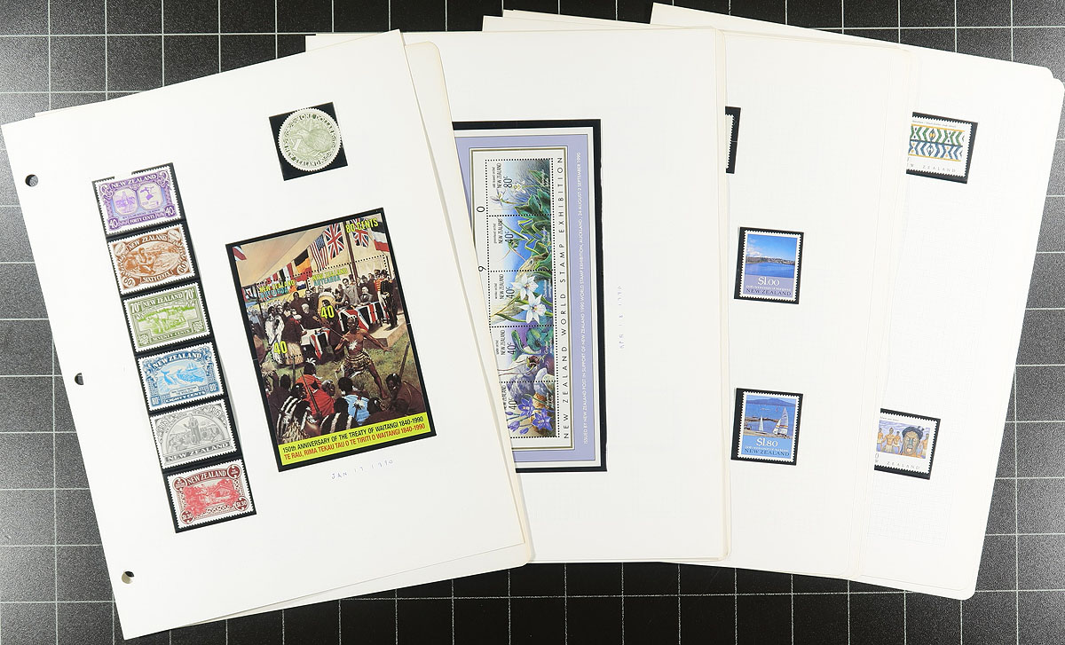 1960's-1990's mint and used collection (sometimes mint, sometimes used, sometimes both). All neatly mounted in black mounts on quadrilled pages. Quite complete throughout this time period (there is a bit of earlier 20th century, which we have not counted). Better mint includes £1 pink geyser, 2 sets of the $4-$10 "Arms", some blocks, better values such as the $10 Kiwi, a couple of complete booklets and even a bit of Tokelau and Ross Dependency, but no "health" semi-postals. The face value of the 1980's onward material is about NZ$200.00. Estimate =