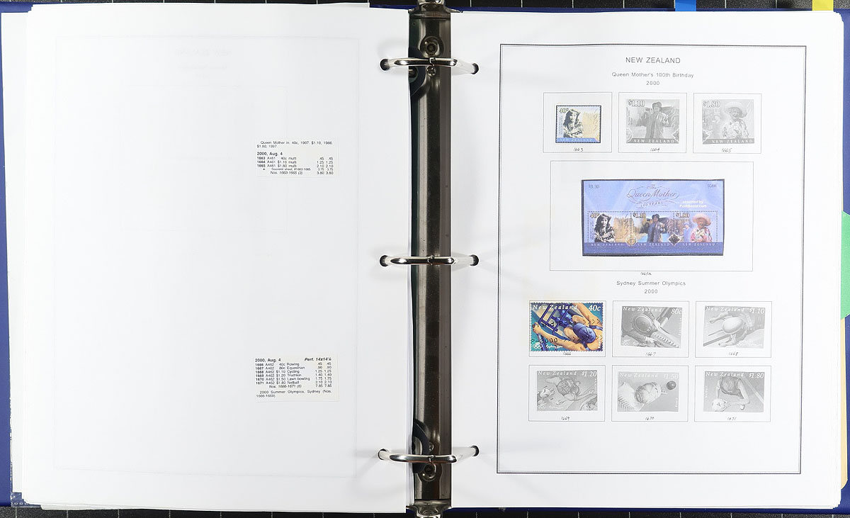 Computer generated album pages from 1855 to 2005 containing regular issues plus "Back of the Book". The stamps go from 1874 to 2005. Regular issues with 1,131 stamps catalogued by Scott in 2015 at US$1,151.35 and "Back of the Book" having 169 stamps cataloguing US$208.55. Damaged stamps not counted. Mostly used but some mint also. Many complete sets. Please note while looking at the scanned images that colour photocopies of stamps on the pages are also abundant. This makes it difficult to examine the lot online. This lot comes with bonus material, being a group of Scott Specialty pages with an assortment of pre-1975 issues and a binder with homemade pages with a nice range of Health issues (no souvenir sheets) and Christmas issues up to 1999, both of which hold surprising catalogue value. Estimate =