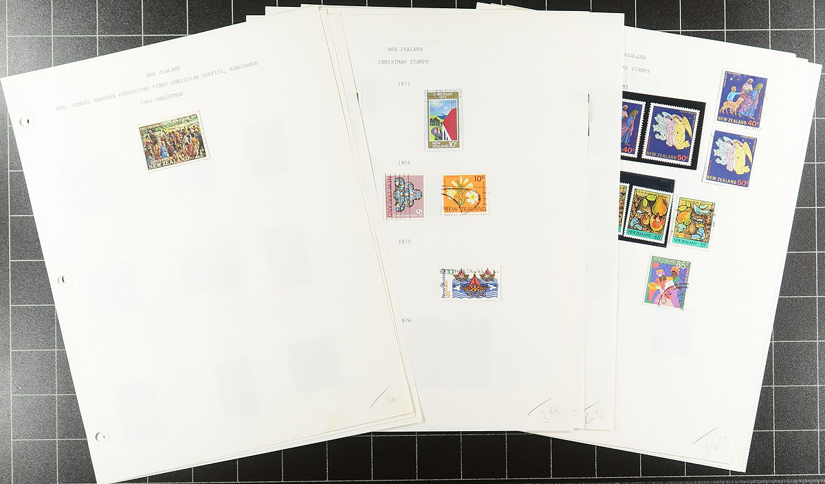Computer generated album pages from 1855 to 2005 containing regular issues plus "Back of the Book". The stamps go from 1874 to 2005. Regular issues with 1,131 stamps catalogued by Scott in 2015 at US$1,151.35 and "Back of the Book" having 169 stamps cataloguing US$208.55. Damaged stamps not counted. Mostly used but some mint also. Many complete sets. Please note while looking at the scanned images that colour photocopies of stamps on the pages are also abundant. This makes it difficult to examine the lot online. This lot comes with bonus material, being a group of Scott Specialty pages with an assortment of pre-1975 issues and a binder with homemade pages with a nice range of Health issues (no souvenir sheets) and Christmas issues up to 1999, both of which hold surprising catalogue value. Estimate =